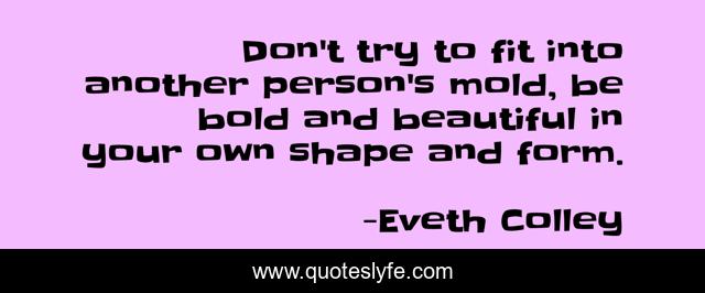This page presents the quote "Don't try to fit into another person's mold, be bold and beautiful in your own shape and form.". Author of this quote is Eveth Colley. This quote is about beautiful, mold, bold,.