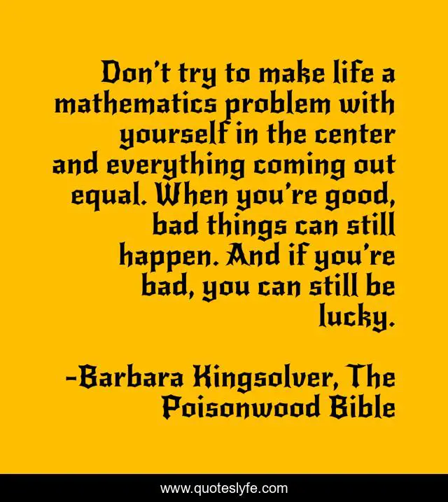 This page presents the quote "Don’t try to make life a mathematics problem with yourself in the center and everything coming out equal. When you’re good, bad things can still happen. And if you’re bad, you can still be lucky.". Author of this quote is Barbara Kingsolver, The Poisonwood Bible. This quote is about unfairness, life,.