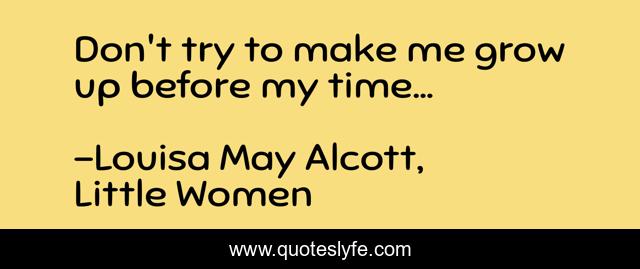 This page presents the quote "Don't try to make me grow up before my time…". Author of this quote is Louisa May Alcott, Little Women. This quote is about little-women, louisa-may-alcott, growing-up,.