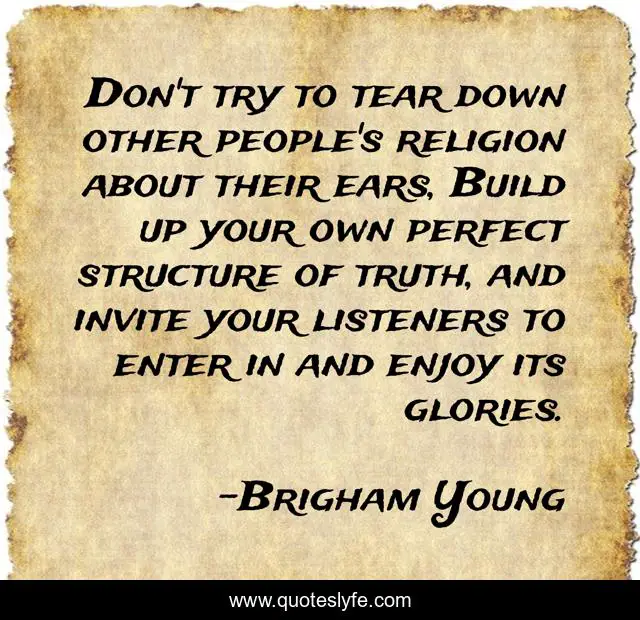 This page presents the quote "Don't try to tear down other people's religion about their ears, Build up your own perfect structure of truth, and invite your listeners to enter in and enjoy its glories.". Author of this quote is Brigham Young. This quote is about enjoy, truth, people,.