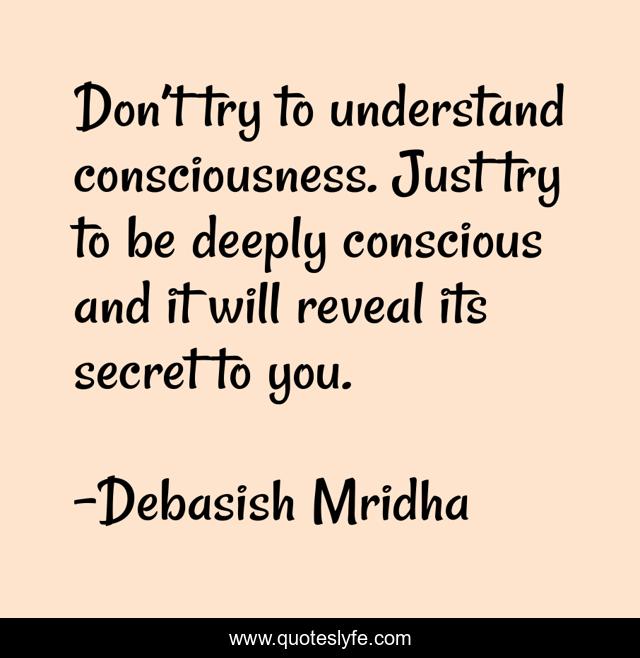 This page presents the quote "Don’t try to understand consciousness. Just try to be deeply conscious and it will reveal its secret to you.". Author of this quote is Debasish Mridha. This quote is about secret-of-consciousness, consciousness, philosophy, debasish-mridha, quotes, inspirational, enthusiasm, don-t-try-to-understand, debasish-mridha-m-d,.