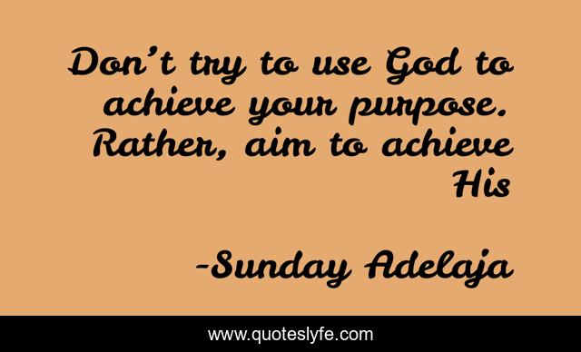 This page presents the quote "Don’t try to use God to achieve your purpose. Rather, aim to achieve His". Author of this quote is Sunday Adelaja. This quote is about life, blessing, finance, money, divine-purpose, work, obedience, job, purpose,.