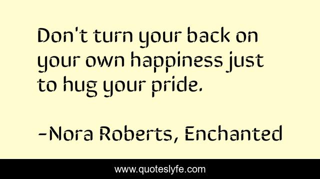 This page presents the quote "Don't turn your back on your own happiness just to hug your pride.". Author of this quote is Nora Roberts, Enchanted. This quote is about love, donovan, happiness, pride, mrs-donovan, affection,.