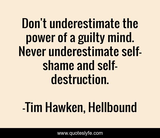 This page presents the quote "Don't underestimate the power of a guilty mind. Never underestimate self-shame and self-destruction.". Author of this quote is Tim Hawken, Hellbound. This quote is about shame, self-shame, guilt, self-destruction,.