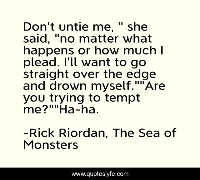 This page presents the quote "Don't untie me, " she said, "no matter what happens or how much I plead. I'll want to go straight over the edge and drown myself.""Are you trying to tempt me?""Ha-ha.". Author of this quote is Rick Riordan, The Sea of Monsters. This quote is about percy-jackson, annabeth, the-olympians,.