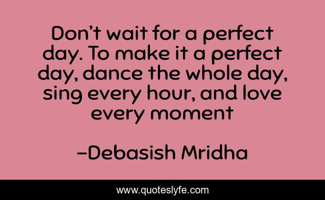 This page presents the quote "Don’t wait for a perfect day. To make it a perfect day, dance the whole day, sing every hour, and love every moment". Author of this quote is Debasish Mridha. This quote is about miraboli, oscar-wilde, philosophy, debasish-mridha, sing-every-hour, love-every-moment, quotes, buddha, debasish-mridha-md,.
