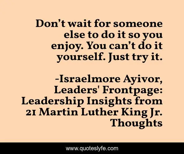 This page presents the quote "Don’t wait for someone else to do it so you enjoy. You can’t do it yourself. Just try it.". Author of this quote is Israelmore Ayivor, Leaders' Frontpage: Leadership Insights from 21 Martin Luther King Jr. Thoughts. This quote is about enjoy, try, food-for-thought, martin-luther, depend, do-it-yourself, martin-luther-king-jr, dependent, try-it,.