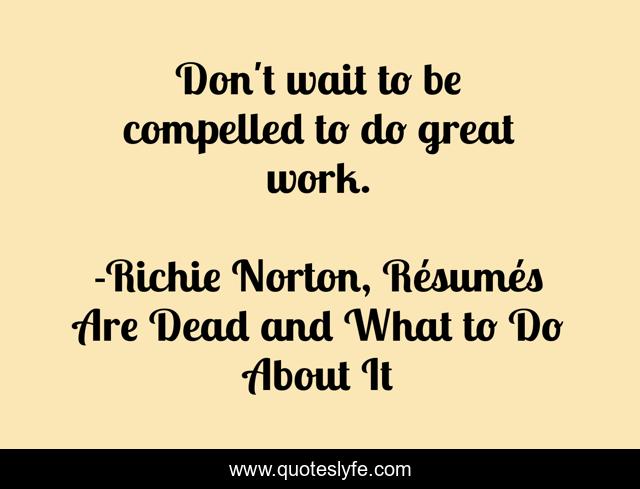 This page presents the quote "Don't wait to be compelled to do great work.". Author of this quote is Richie Norton, Résumés Are Dead and What to Do About It. This quote is about great, business, resume, great-work, entrepreneurship, waiting, leadership, compelled, don-t-wait,.