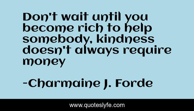 This page presents the quote "Don't wait until you become rich to help somebody, kindness doesn't always require money". Author of this quote is Charmaine J. Forde. This quote is about kindness, somebody, help, rich, require-money,.