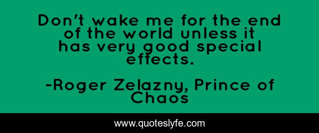 This page presents the quote "Don't wake me for the end of the world unless it has very good special effects.". Author of this quote is Roger Zelazny, Prince of Chaos. This quote is about life, death, cinema, post-modernism, simulacra, armageddon, apocalypse, end-of-the-world,.