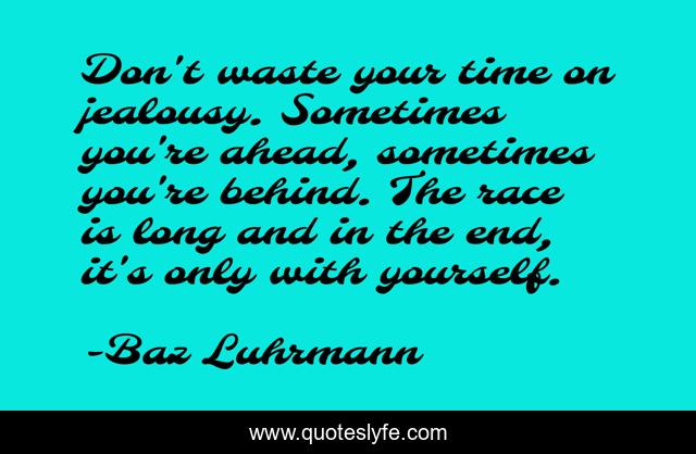 This page presents the quote "Don't waste your time on jealousy. Sometimes you're ahead, sometimes you're behind. The race is long and in the end, it's only with yourself.". Author of this quote is Baz Luhrmann. This quote is about life, purpose, hope, positive-thinking,.