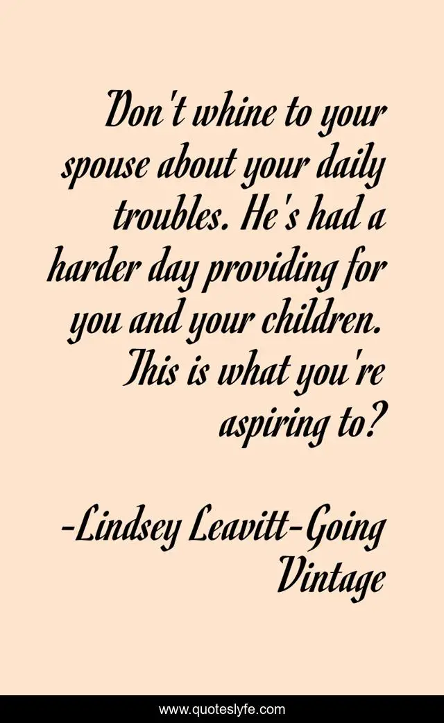 This page presents the quote "Don't whine to your spouse about your daily troubles. He's had a harder day providing for you and your children. This is what you're aspiring to?". Author of this quote is Lindsey Leavitt-Going Vintage. This quote is about humorous, society-thinking,.
