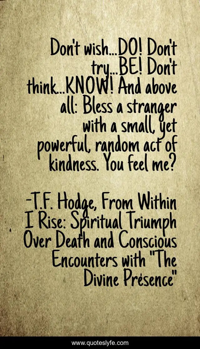 This page presents the quote "Don't wish...DO! Don't try...BE! Don't think...KNOW! And above all: Bless a stranger with a small, yet powerful, random act of kindness. You feel me?". Author of this quote is T.F. Hodge, From Within I Rise: Spiritual Triumph Over Death and Conscious Encounters with "The Divine Presence". This quote is about knowledge, wish, random-acts-of-kindness, powerful, quotes, blessings, action, kindness, dream,.
