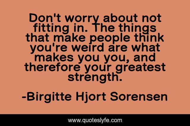 This page presents the quote "Don't worry about not fitting in. The things that make people think you're weird are what makes you you, and therefore your greatest strength.". Author of this quote is Birgitte Hjort Sorensen. This quote is about greatest, worry, people,.
