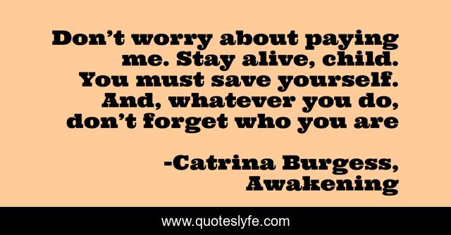 This page presents the quote "Don’t worry about paying me. Stay alive, child. You must save yourself. And, whatever you do, don’t forget who you are". Author of this quote is Catrina Burgess, Awakening. This quote is about dark-fiction, thriller-mystery, paranormal, paranormal-romance, romance, horror, young-adult, fiction-fantasy, thriller,.