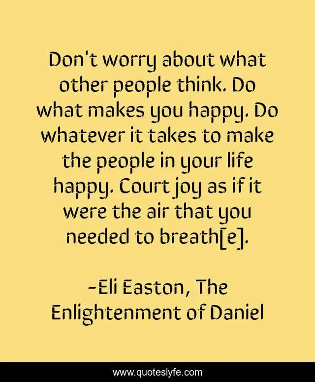 This page presents the quote "Don't worry about what other people think. Do what makes you happy. Do whatever it takes to make the people in your life happy. Court joy as if it were the air that you needed to breath[e].". Author of this quote is Eli Easton, The Enlightenment of Daniel. This quote is about joy, happiness, love, life-lessons, affection,.