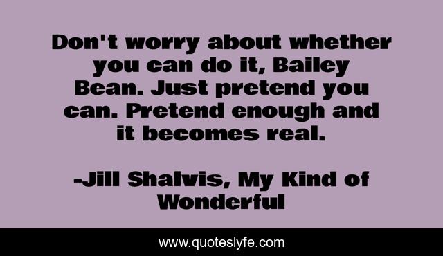 This page presents the quote "Don't worry about whether you can do it, Bailey Bean. Just pretend you can. Pretend enough and it becomes real.". Author of this quote is Jill Shalvis, My Kind of Wonderful. This quote is about ski-resort, cancer-survivor, contemporary-romance, snowy-romance,.