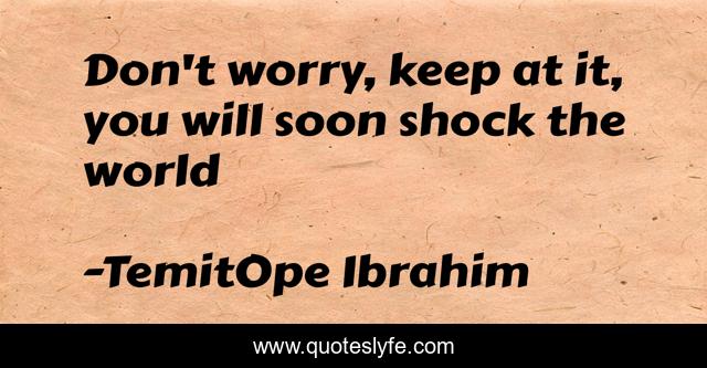 This page presents the quote "Don't worry, keep at it, you will soon shock the world". Author of this quote is TemitOpe Ibrahim. This quote is about life, don-t-worry, inspirational, keep-at-it, motivational, confidence, shock, optimistic, truth,.