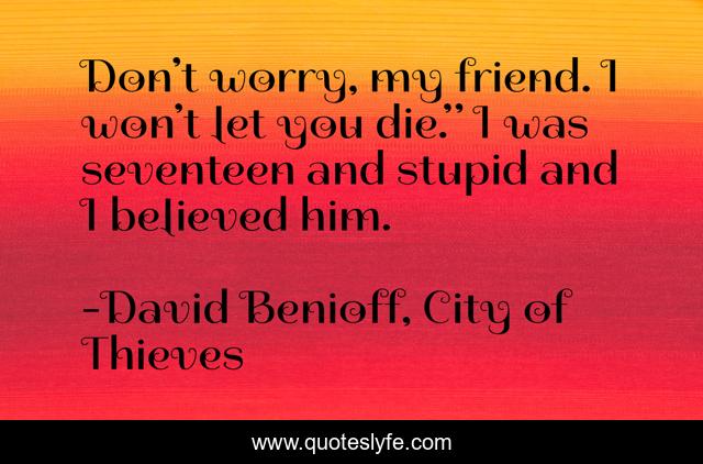 This page presents the quote "Don’t worry, my friend. I won’t let you die.” I was seventeen and stupid and I believed him.". Author of this quote is David Benioff, City of Thieves. This quote is about death, stupid, teenagers,.