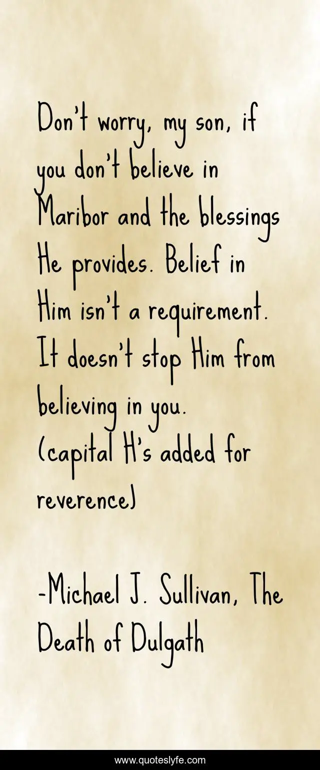 This page presents the quote "Don't worry, my son, if you don't believe in Maribor and the blessings He provides. Belief in Him isn't a requirement. It doesn't stop Him from believing in you. (capital H's added for reverence)". Author of this quote is Michael J. Sullivan, The Death of Dulgath. This quote is about belief-in-god, belief,.