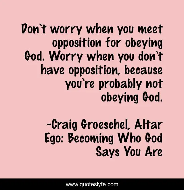 This page presents the quote "Don’t worry when you meet opposition for obeying God. Worry when you don’t have opposition, because you’re probably not obeying God.". Author of this quote is Craig Groeschel, Altar Ego: Becoming Who God Says You Are. This quote is about god, christianity, boldness, obey, oposition,.