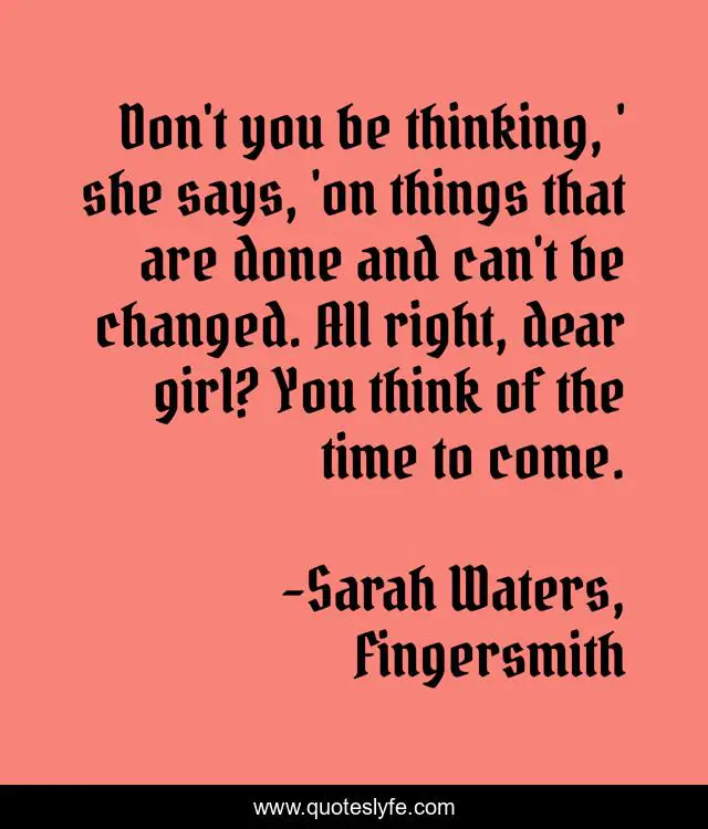 This page presents the quote "Don't you be thinking, ' she says, 'on things that are done and can't be changed. All right, dear girl? You think of the time to come.". Author of this quote is Sarah Waters, Fingersmith. This quote is about sarah-waters, fingersmith, past, future, present, inspirational, time, enthusiasm, thoughts,.