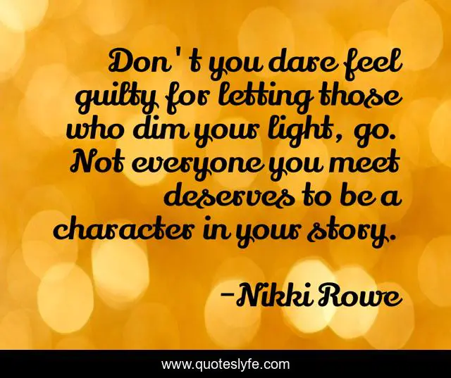 This page presents the quote "Don't you dare feel guilty for letting those who dim your light, go. Not everyone you meet deserves to be a character in your story.". Author of this quote is Nikki Rowe. This quote is about move-on, freedom, trust-yoursf, growth, let-go, self-discovery, inner-peace,.