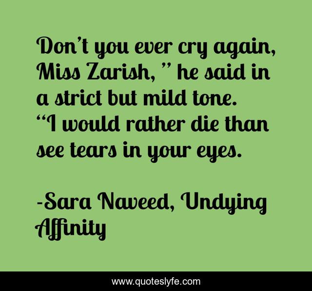 This page presents the quote "Don’t you ever cry again, Miss Zarish, ” he said in a strict but mild tone. “I would rather die than see tears in your eyes.". Author of this quote is Sara Naveed, Undying Affinity. This quote is about love, lovestory, fiction, romance, chicklit, pakistaniauthor, undyingaffinity, contemporaryromance, ahmarzarish,.