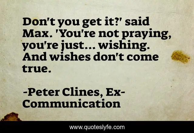 This page presents the quote "Don't you get it?' said Max. 'You're not praying, you're just... wishing. And wishes don't come true.". Author of this quote is Peter Clines, Ex-Communication. This quote is about faith, max-hale, ex-communication, zombiapocolypse, zombies,.