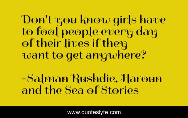 This page presents the quote "Don't you know girls have to fool people every day of their lives if they want to get anywhere?". Author of this quote is Salman Rushdie, Haroun and the Sea of Stories. This quote is about girls, trickery,.