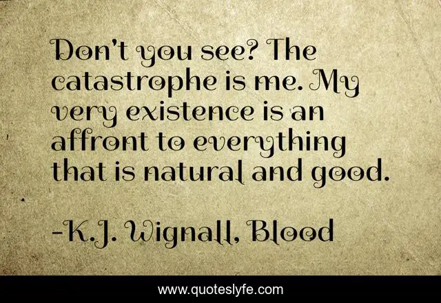 This page presents the quote "Don't you see? The catastrophe is me. My very existence is an affront to everything that is natural and good.". Author of this quote is K.J. Wignall, Blood. This quote is about anger, helplessness, blood, vampires,.