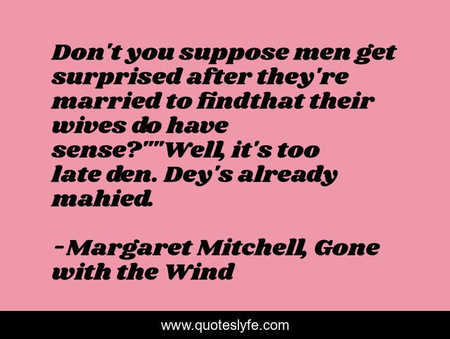 This page presents the quote "Don't you suppose men get surprised after they're married to findthat their wives do have sense?""Well, it's too late den. Dey's already mahied.". Author of this quote is Margaret Mitchell, Gone with the Wind. .