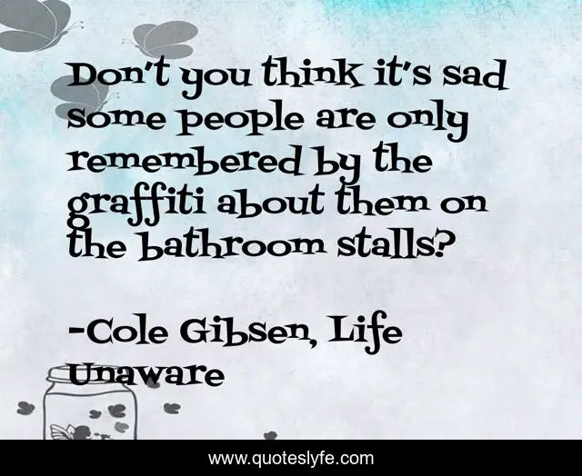 This page presents the quote "Don’t you think it’s sad some people are only remembered by the graffiti about them on the bathroom stalls?". Author of this quote is Cole Gibsen, Life Unaware. This quote is about bullying, ya, young-adult,.
