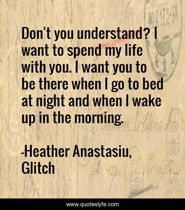 This page presents the quote "Don't you understand? I want to spend my life with you. I want you to be there when I go to bed at night and when I wake up in the morning.". Author of this quote is Heather Anastasiu, Glitch. This quote is about being-in-love, falling-in-love, love, in-love, affection,.