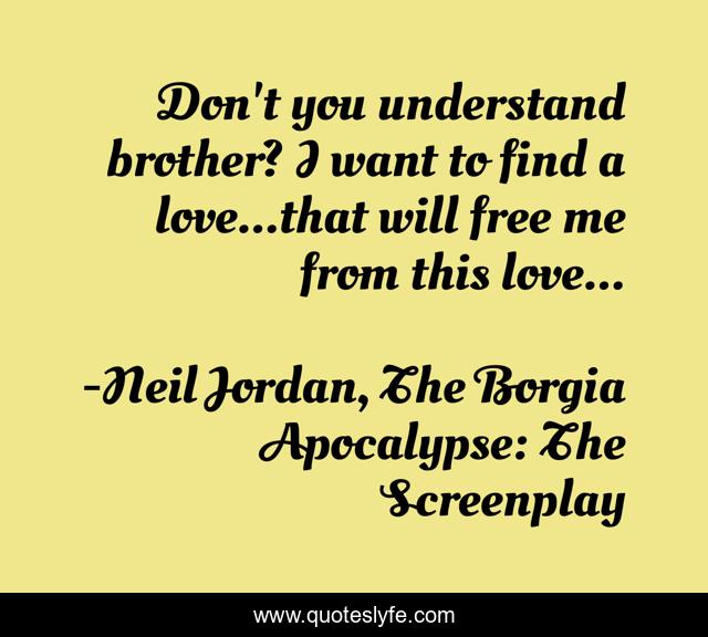 This page presents the quote "Don't you understand brother? I want to find a love...that will free me from this love...". Author of this quote is Neil Jordan, The Borgia Apocalypse: The Screenplay. This quote is about incest, historical-fiction, historical-romance,.