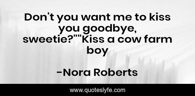 This page presents the quote "Don't you want me to kiss you goodbye, sweetie?""Kiss a cow farm boy". Author of this quote is Nora Roberts. This quote is about kiss, farm, shane, pretty, kissing, rebecca, mackade,.