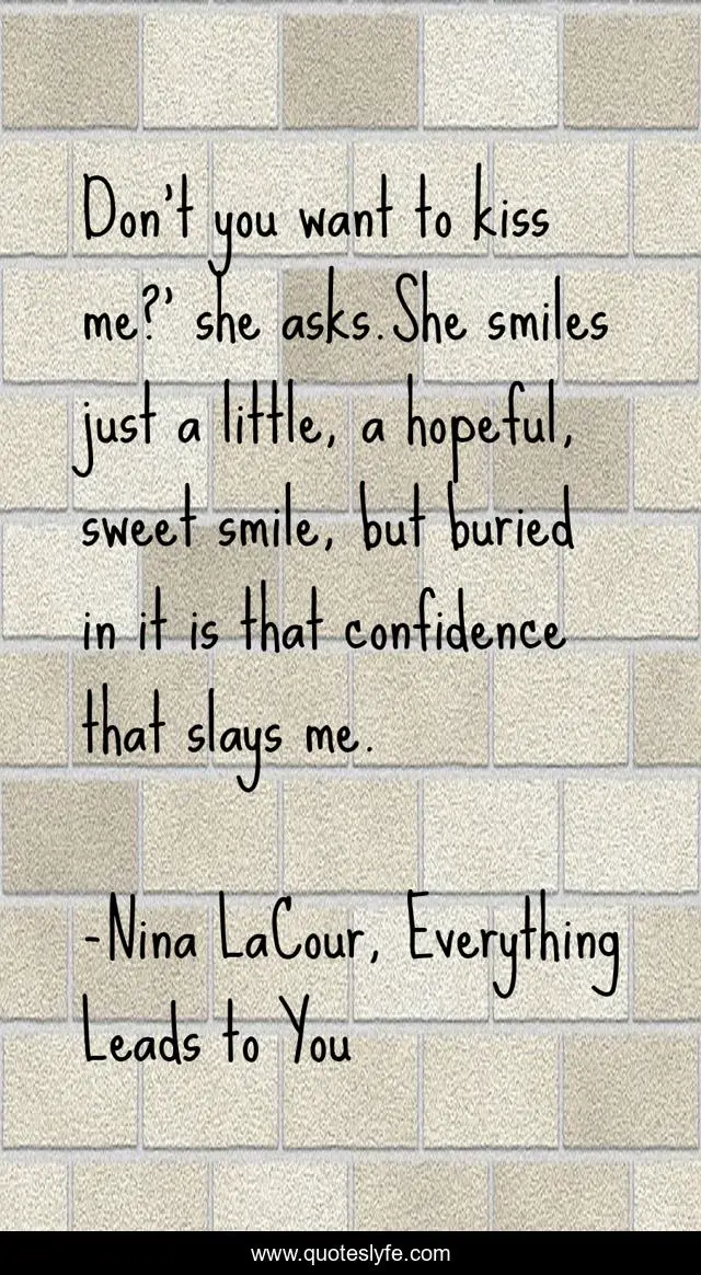 This page presents the quote "Don't you want to kiss me?' she asks.She smiles just a little, a hopeful, sweet smile, but buried in it is that confidence that slays me.". Author of this quote is Nina LaCour, Everything Leads to You. This quote is about kissing, love, affection,.