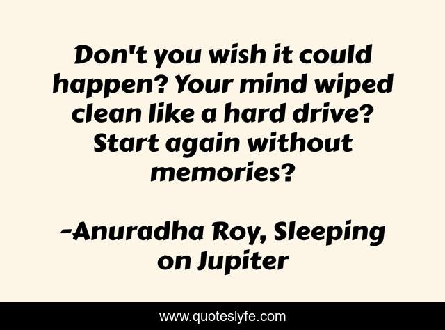 This page presents the quote "Don't you wish it could happen? Your mind wiped clean like a hard drive? Start again without memories?". Author of this quote is Anuradha Roy, Sleeping on Jupiter. .