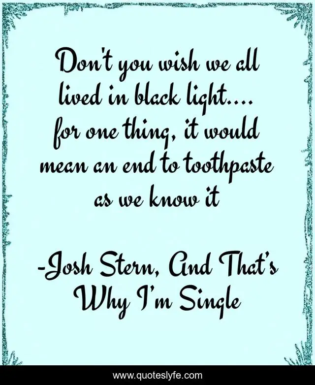 This page presents the quote "Don't you wish we all lived in black light.... for one thing, it would mean an end to toothpaste as we know it". Author of this quote is Josh Stern, And That’s Why I’m Single. This quote is about funny, crazy, funny-and-random, humor, romance, strange, passion, absurd, love,.