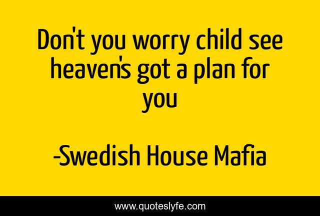 This page presents the quote "Don't you worry child see heaven's got a plan for you". Author of this quote is Swedish House Mafia. This quote is about spiritual, heaven, song, god, future, hapiness,.