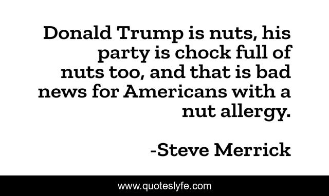 This page presents the quote "Donald Trump is nuts, his party is chock full of nuts too, and that is bad news for Americans with a nut allergy.". Author of this quote is Steve Merrick. This quote is about politics, politicians, donald-trump, political-s,.