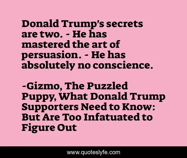 This page presents the quote "Donald Trump's secrets are two. - He has mastered the art of persuasion. - He has absolutely no conscience.". Author of this quote is Gizmo, The Puzzled Puppy, What Donald Trump Supporters Need to Know: But Are Too Infatuated to Figure Out. This quote is about conscience, donald-trump, con-artists,.