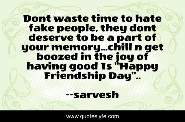 This page presents the quote "Dont waste time to hate fake people, they dont deserve to be a part of your memory...chill n get boozed in the joy of having good 1s "Happy Friendship Day"..". Author of this quote is -sarvesh. This quote is about famous, friendship-and-love, true-friends, friendship, best-friends,.