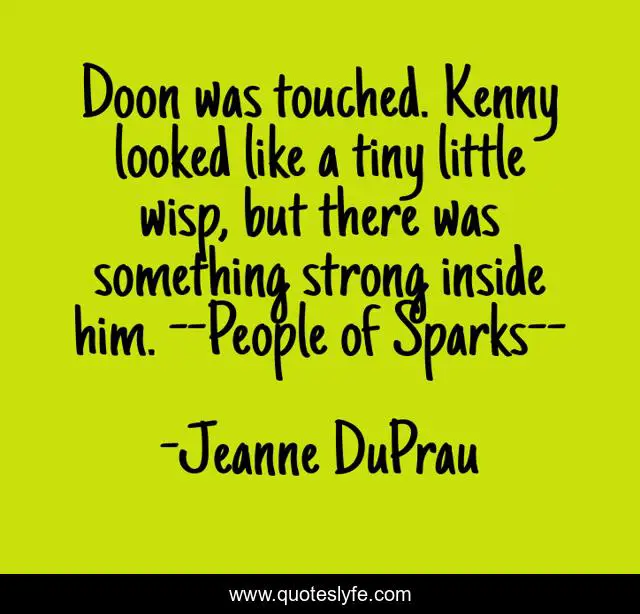 This page presents the quote "Doon was touched. Kenny looked like a tiny little wisp, but there was something strong inside him. --People of Sparks--". Author of this quote is Jeanne DuPrau. This quote is about strength, belief, jeanne-duprau, truth, books-of-ember, city-of-ember, friendship,.