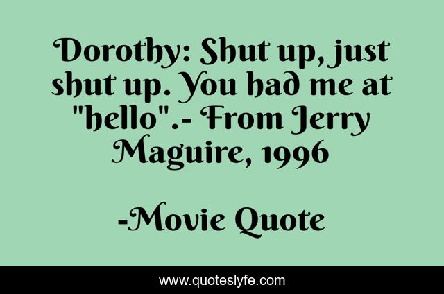 This page presents the quote "Dorothy: Shut up, just shut up. You had me at "hello".- From Jerry Maguire, 1996". Author of this quote is Movie Quote. .