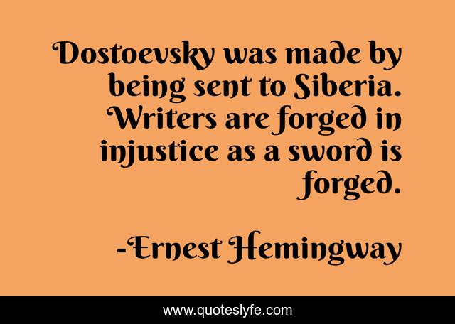 This page presents the quote "Dostoevsky was made by being sent to Siberia. Writers are forged in injustice as a sword is forged.". Author of this quote is Ernest Hemingway. This quote is about writers, writing,.
