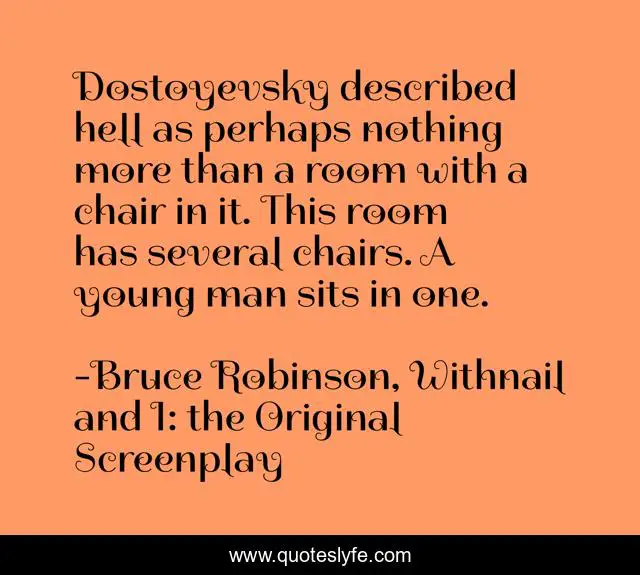 This page presents the quote "Dostoyevsky described hell as perhaps nothing more than a room with a chair in it. This room has several chairs. A young man sits in one.". Author of this quote is Bruce Robinson, Withnail and I: the Original Screenplay. This quote is about dostoevsky, comedy, hell,.