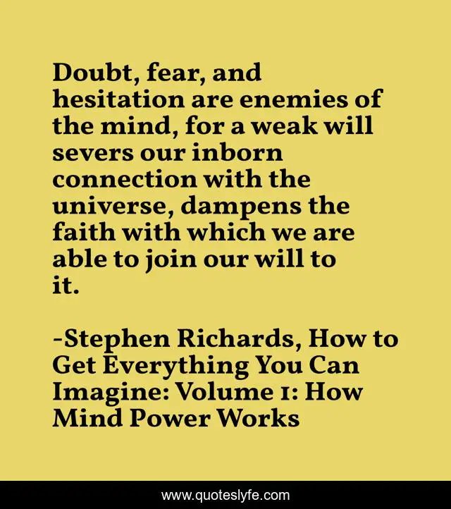 This page presents the quote "Doubt, fear, and hesitation are enemies of the mind, for a weak will severs our inborn connection with the universe, dampens the faith with which we are able to join our will to it.". Author of this quote is Stephen Richards, How to Get Everything You Can Imagine: Volume 1: How Mind Power Works. This quote is about stephen-richards, overcome-doubt, wishes, self-help, self-limiting-beliefs, mind-power,.