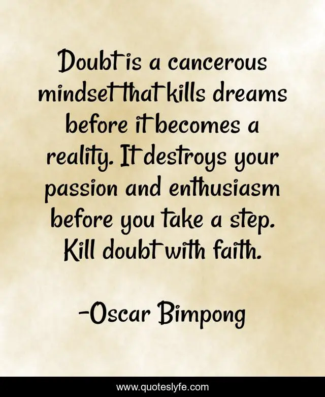 This page presents the quote "Doubt is a cancerous mindset that kills dreams before it becomes a reality. It destroys your passion and enthusiasm before you take a step. Kill doubt with faith.". Author of this quote is Oscar Bimpong. This quote is about faith, enthusiastic, doubt, passion, dream-killers, mindset,.