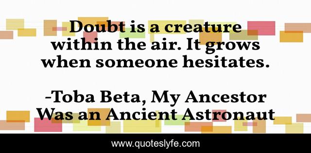 This page presents the quote "Doubt is a creature within the air. It grows when someone hesitates.". Author of this quote is Toba Beta, My Ancestor Was an Ancient Astronaut. This quote is about ghost, hesitation, doubt, truth, spirit, creature,.